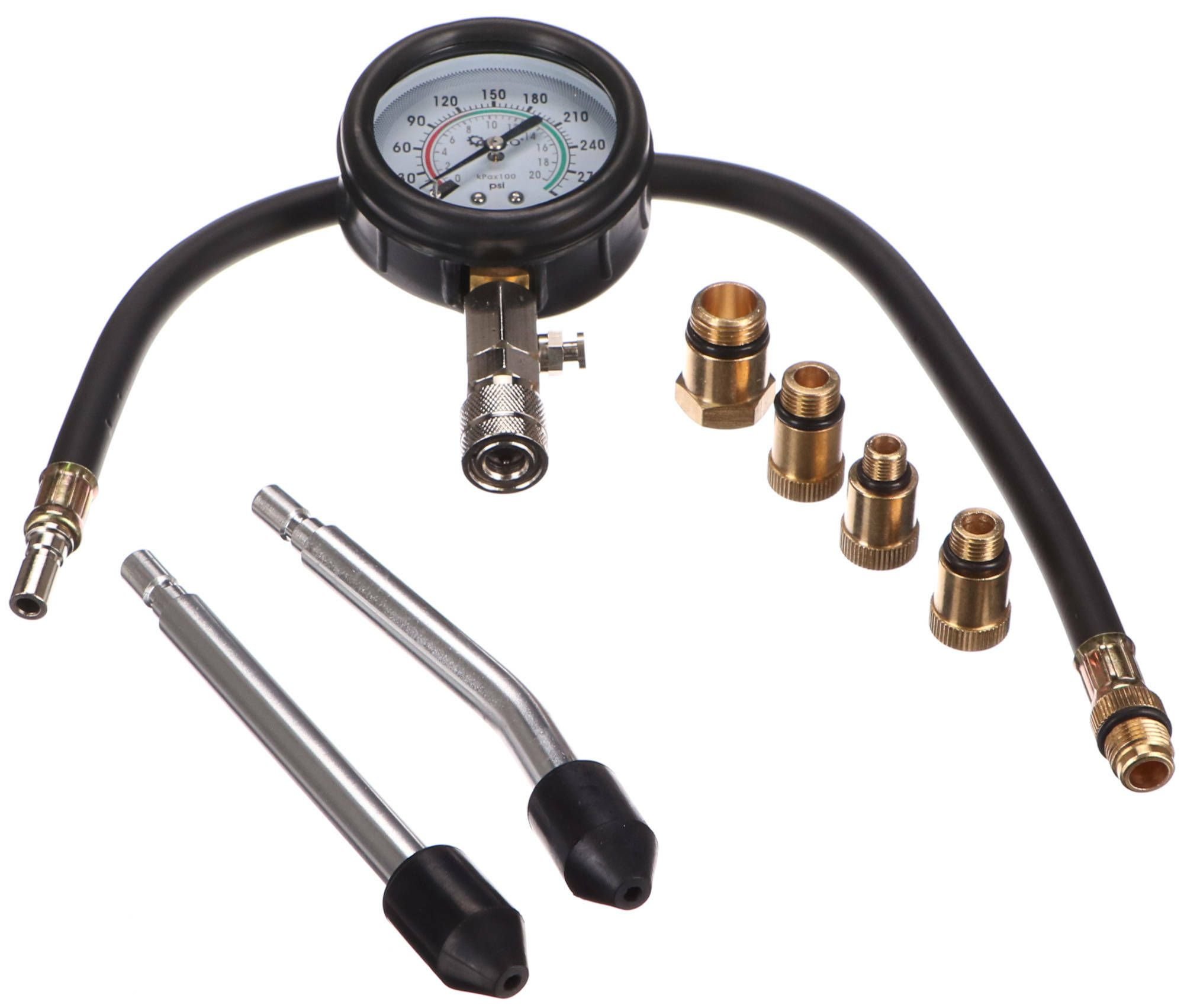 Tester tlaku benzínového motoru je nezbytným nástrojem pro všechny, kdo se starají o spolehlivost svého vozidla. Díky analogovému manometru s širokým rozsahem až do 20 bar (0-300 PSI) můžete přesně sledovat tlak a vyhodnotit stav motoru rychle a bez komplikací. Flexibilní hadice o délce cca 49 cm umožňuje pohodlné použití i na těžko přístupných místech. Navíc jsou k dispozici čtyři různé závitové koncovky (M10x1,0, M12x1,25, M14x1,25, M18x1,25), které zaručují kompatibilitu s většinou benzínových motorů.