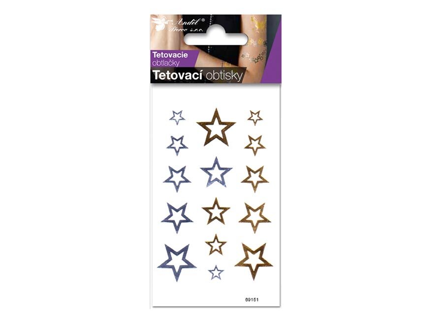 Vytvořte si jedinečný vzhled s našimi tetovacími obtisky ve zlaté a stříbrné barvě s motivem hvězd. Perfektní volba pro každého, kdo chce ozvláštnit svůj vzhled na pár dnů, a to snadno a rychle, bez nutnosti profesionálního tetování.