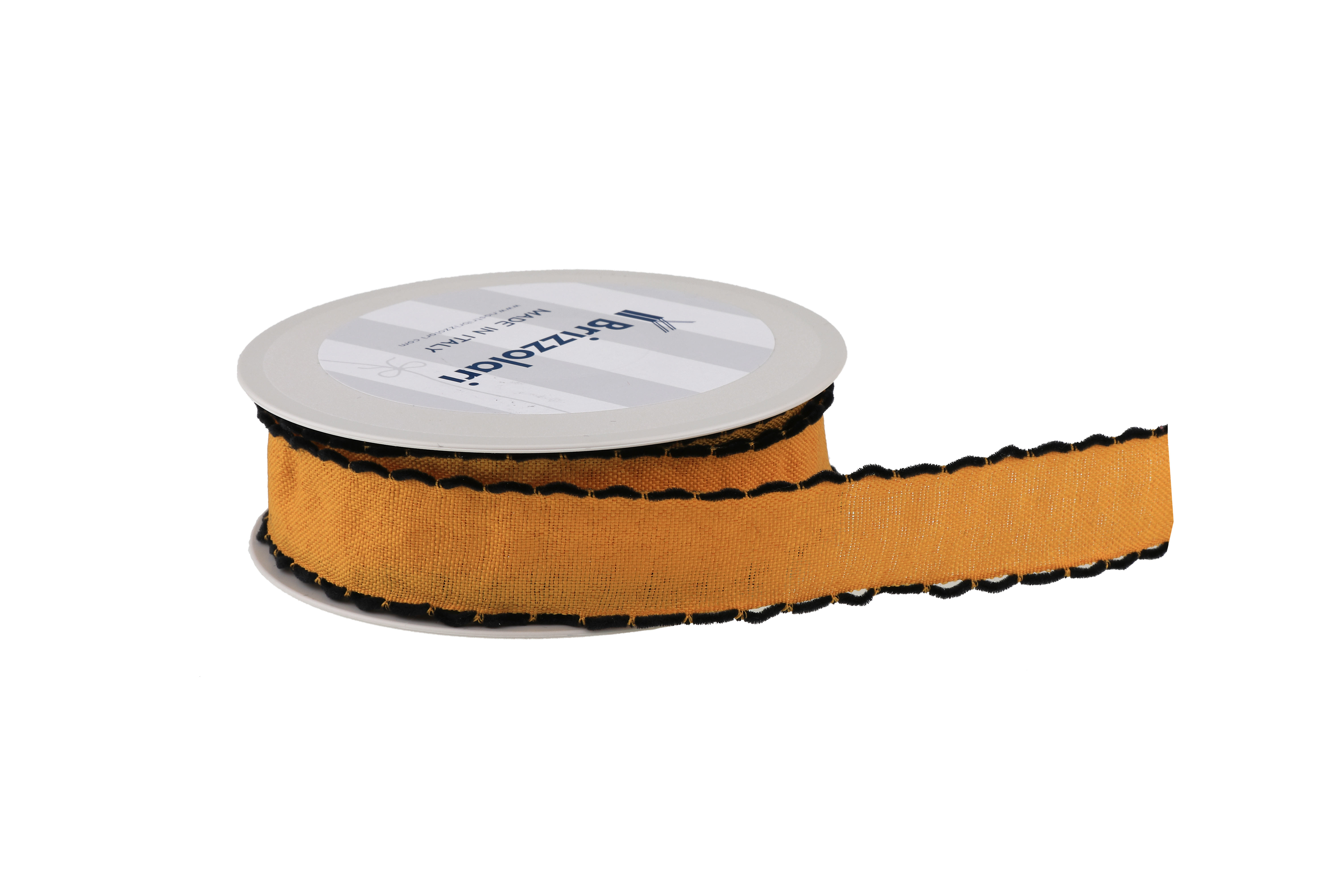 Celoroční dvoubarevná žlutá textilní stuha s našitým lemem v černé barvě . K profesionálnímu balení dárku a květinovému aranžmá. Vyrobeno v Itálii.