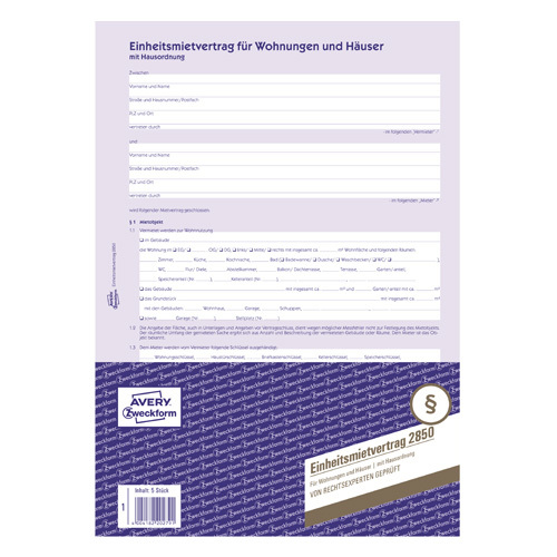 Nájemní smlouva pro pronájem bytů a domů 2850 značky Avery Zweckform ve formátu A4 vytváří jasné podmínky, bez ohledu na to, zda jste nájemcem nebo pronajímatelem. 6 stranná nájemní smlouva poskytuje spolehlivý a osvědčený základ pro bezpečné vypořádání nájmu, s předávacím protokolem a domovním řádem a je pravidelně revidována a upravována advokáty pro změny v nájemním právu.Předtištěný německý text.