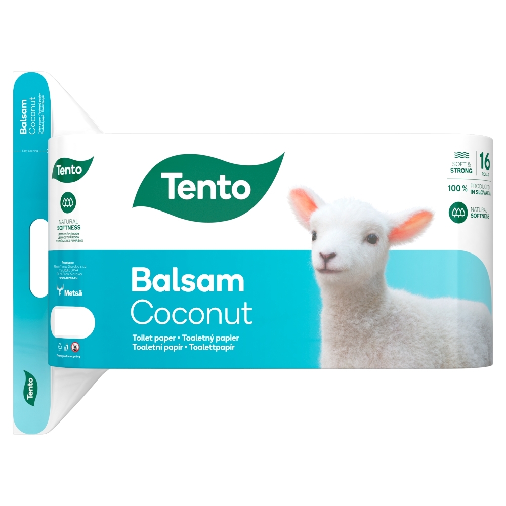 Třívrstvý toaletní papír Tento Balsam Coconut zářivě bílé barvy obsahující příjemnou vůní kokosového mléka vyniká svou vysokou kvalitou a mimořádnou jemností, která zaručuje velmi měkký dotek a dodá vám pocit čistoty a svěžesti. Toaletní papír Tento je obohacen o kokosové mléko s vyživujícím a hydratačním účinkem, díky kterému je vhodný i pro péči o citlivou pokožku. Jeho hebká textura pokožku nedráždí a zanechává ji dokonale čistou. Papír je vyroben ze 100% celulózy. Balení obsahuje 16 rolí papíru, jedna role má návin 18,85 metrů se 142 útržky.