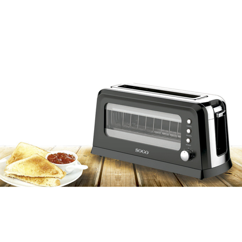 Topinkovač SS-5445 se skleněným průzorem, příkon: až 900 W., 1 dlouhý chleb / toast nebo 2 klasické, tlačítko pro zrušení uprostřed cyklu, funkce automatického vyskakování, rozmrazování chleba a funkce ohřevu, LED kontrolky, elektronická regulace teploty - 7 úrovní na toast podle chuti