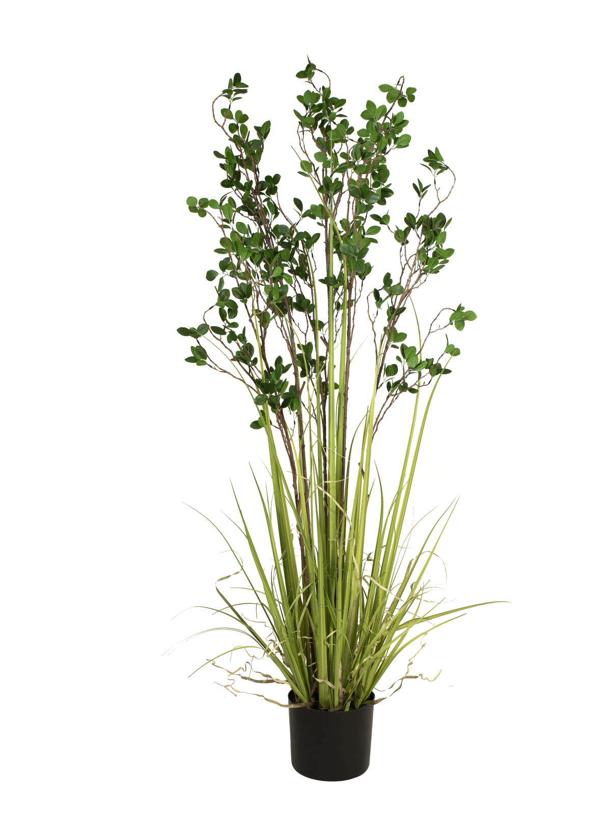 Umělý zelený keř s trávou vytvoří příjemnou atmosféru v obývacím pokoji i neútulné kanceláři. Větve zeleného vřetenového keře vyrůstají ze světle zeleného trsu trávy, která má délkou odstupňované listy. Různé odstíny zelené mezi trávou a listy keře dodávají rostlině jednoduchou eleganci a vyvážený vzhled. Aranžmá má celkovou výšku asi 152 cm a je dodáváno v černém zahradním květináči, vyrobeno z kvalitního plastu.