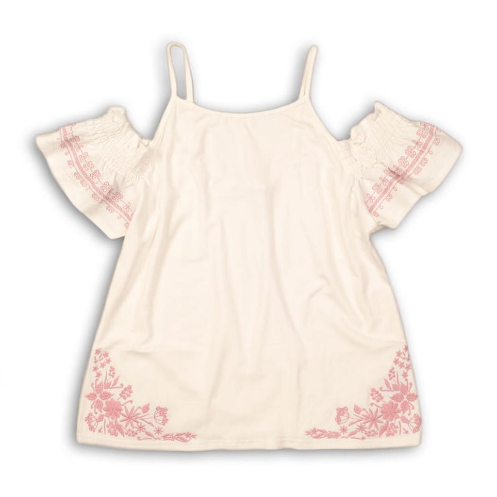Dívčí bílá bavlněná halenka s růžovými nášivkami. Halenka je na ramínka se spadlými rukávy. číst celé