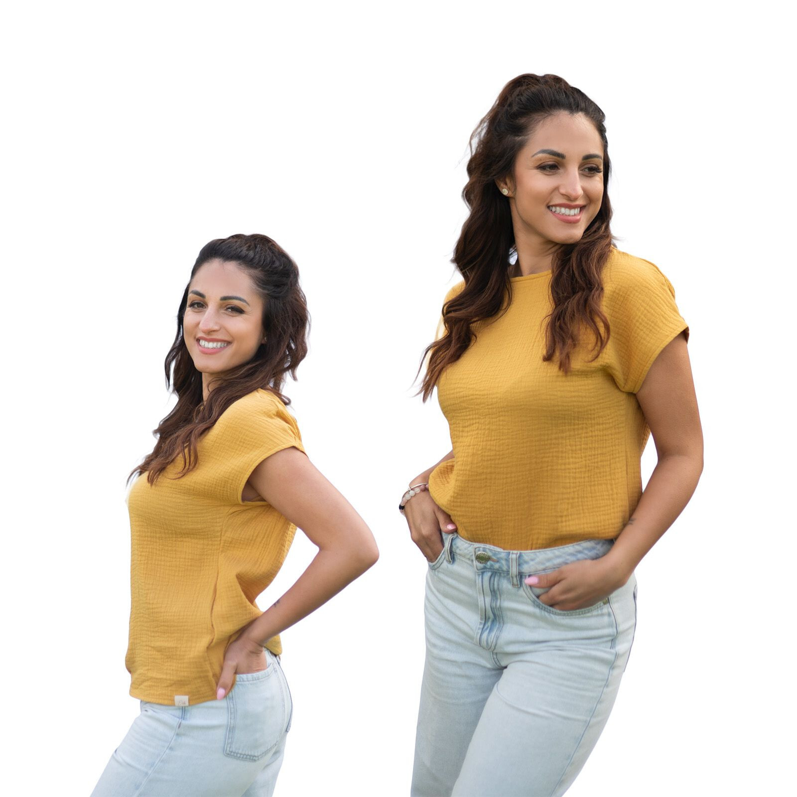 Naše mušelínové tričko Diana Ochre je investice do vašeho každodenního komfortu a stylu.