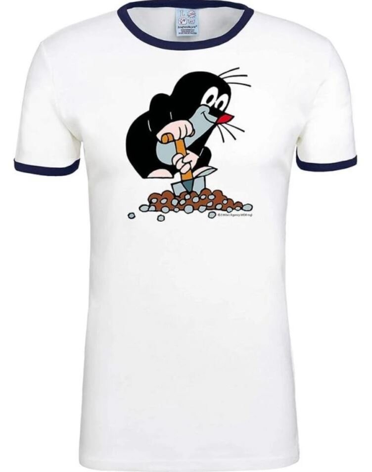 Bavlněné bílé tričko s modrým lemováním s grafikou Krtečka s rýčem na kopečku. Tričko je vhodným dárkem pro všechny menší i větší fanoušky, kteří chtějí mít Krtečka stále u sebe.