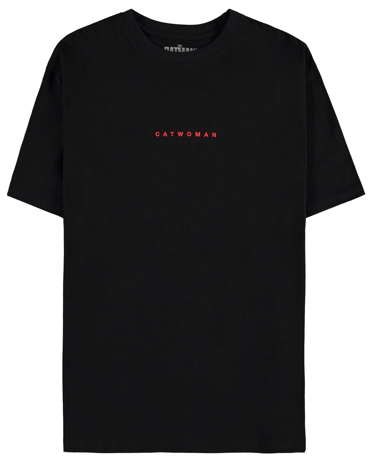 Černé dámské tričko s gumovým těxtovým potiskem Catwoman na přední straně a na zadní straně je Selina Kyle na motorce.