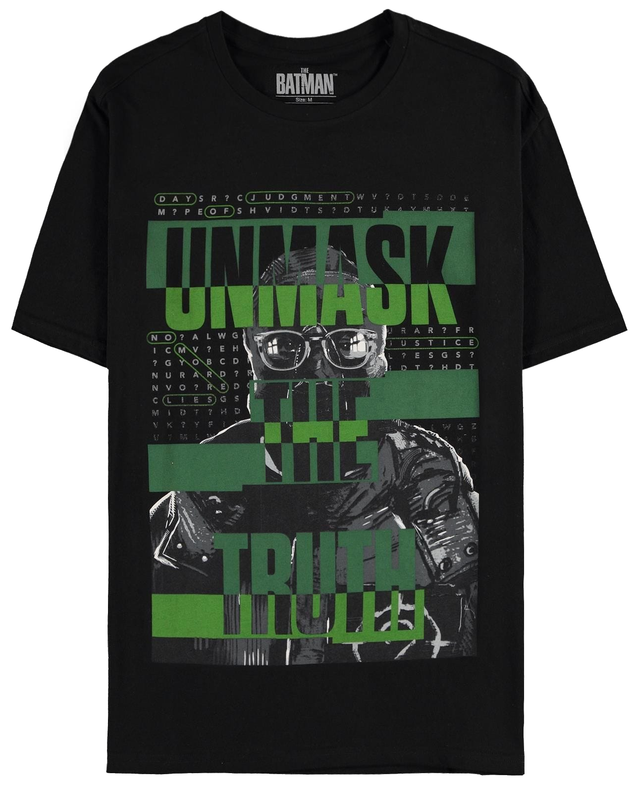 Černé pánské tričko s motivem Superpadoucha Riddlera a jeho slib "odhalit pravdu" o Gotham City.