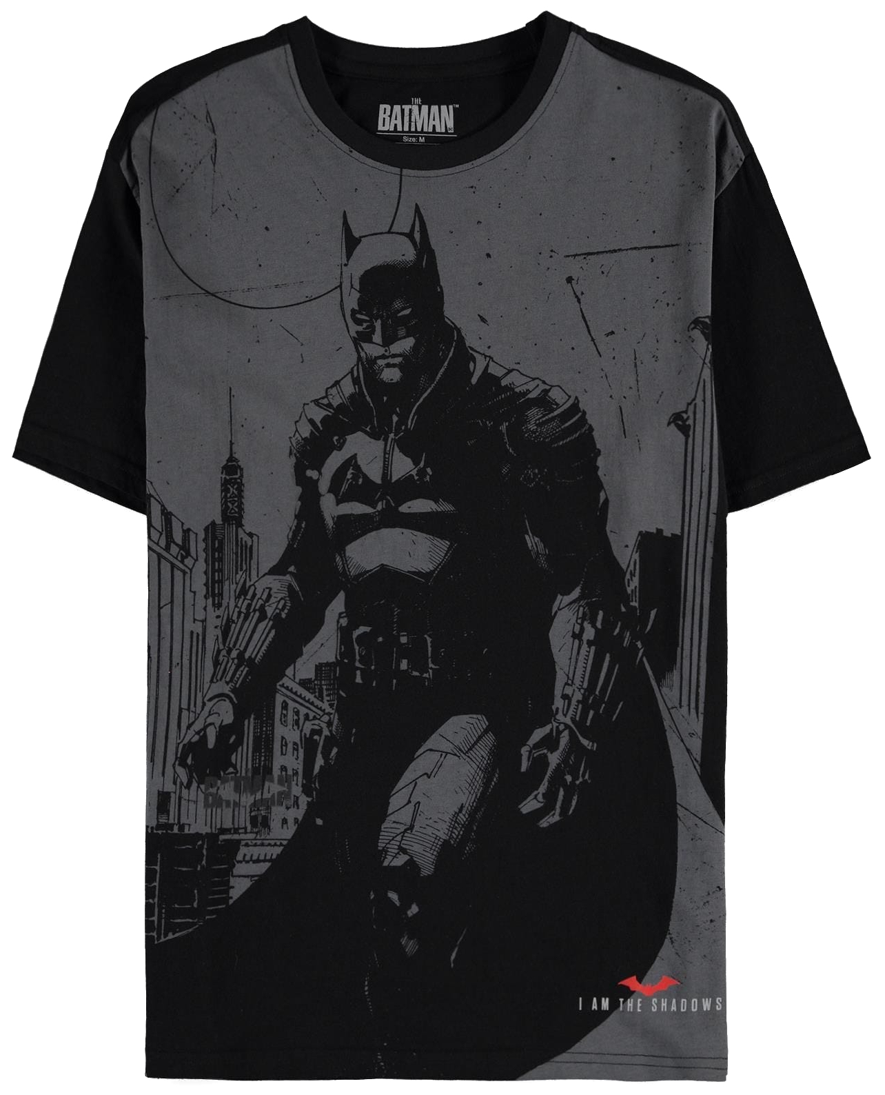 Černé pánské tričko zobrazuje Batmana v jeho milovaném Gotham City.