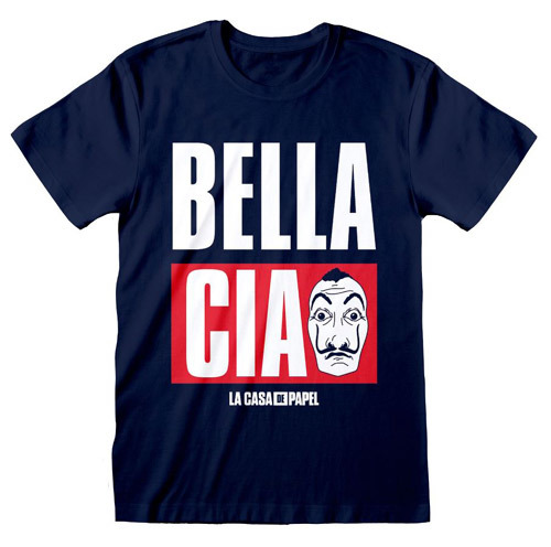 Pánské modré tričko s logem a grafikou postavy El Profesor z TV seriálu La Casa De Papel a nápisem: Bella Cia.
