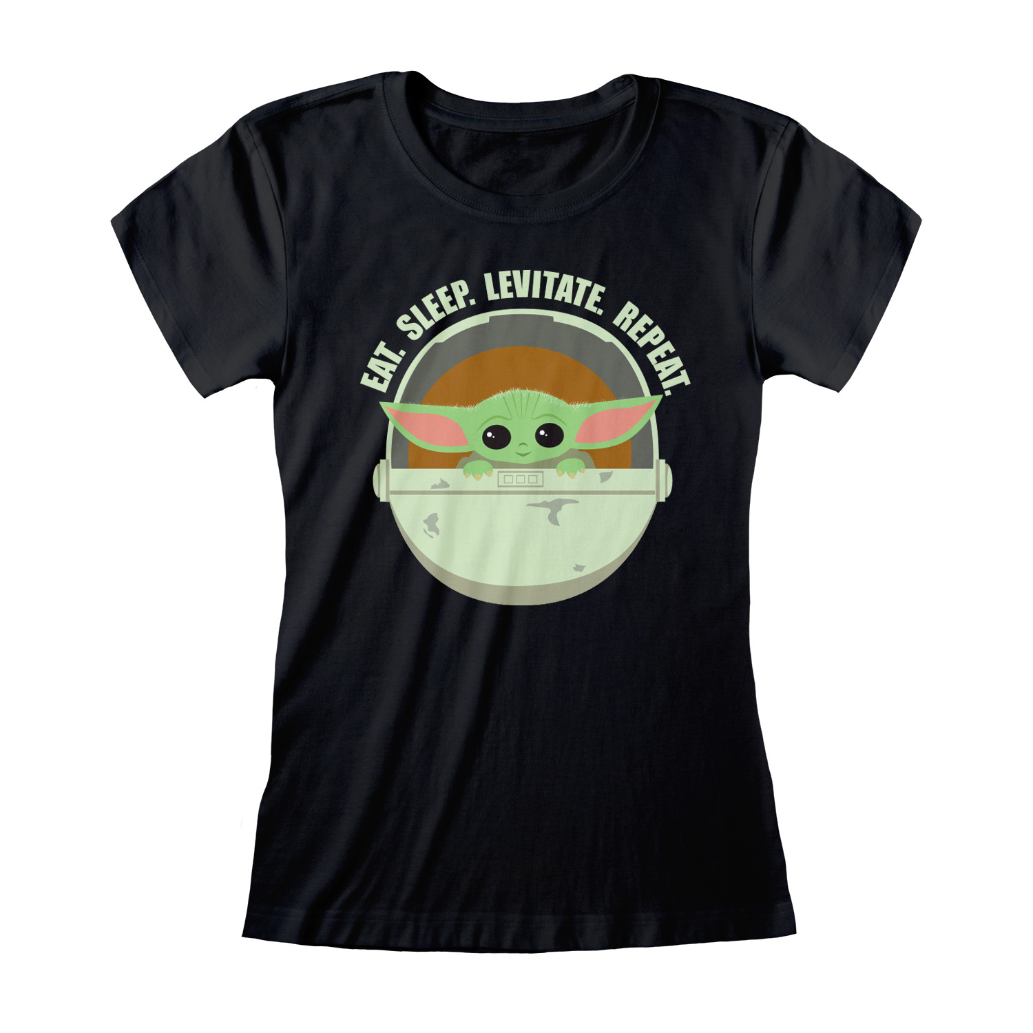 Černé dámské tričko s grafikou baby Yody ze seriálu The Mandalorian a nápisem: Eat, Sleep, Levitate, Repeat.