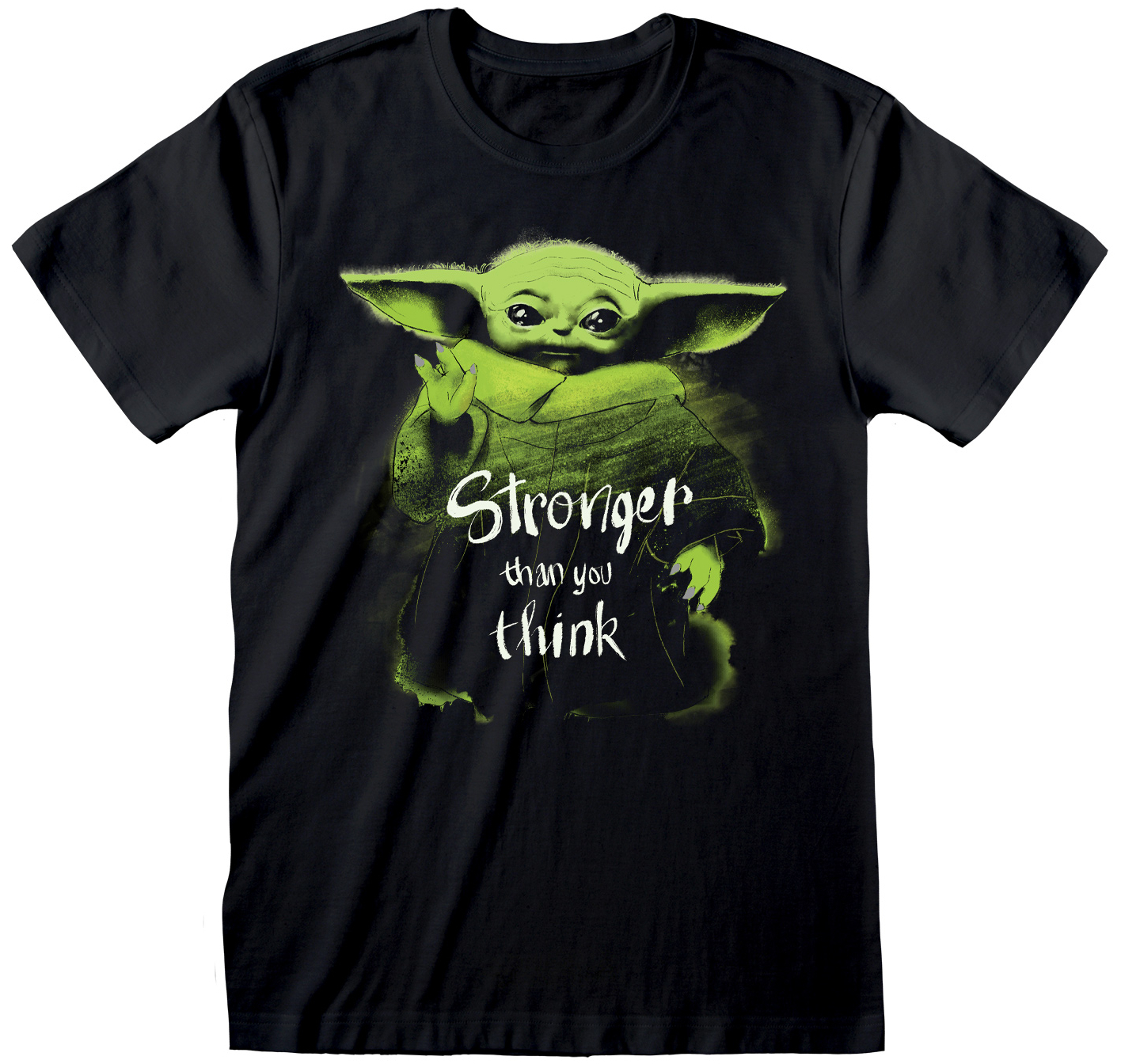 Atraktivní černé pánské tričko s krátkým rukávem s grafikou Baby Yody a nápisem: ,,Stronger than you think" z televizního seriálu Star Wars: The Mandalorian. Tričko je vhodným doplňkem každého fanouška.
