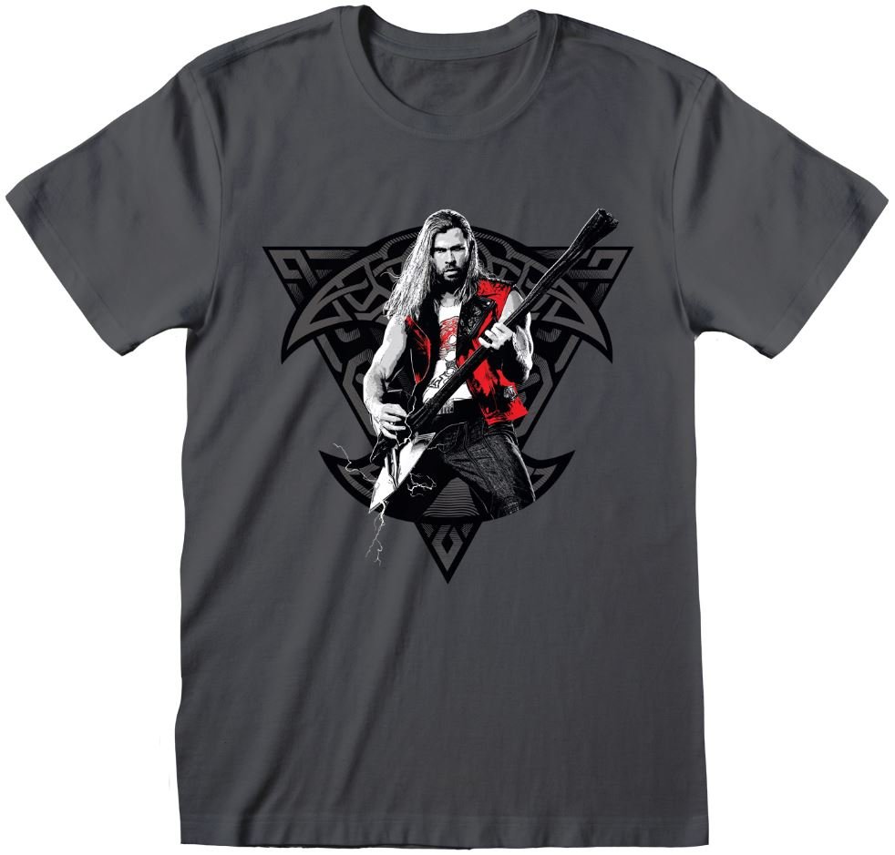 Šedé pánské tričko s motivem superhrdiny Thor hrajícího na kytaru z filmu Thor: Love and Thunder od společnosti Marvel.