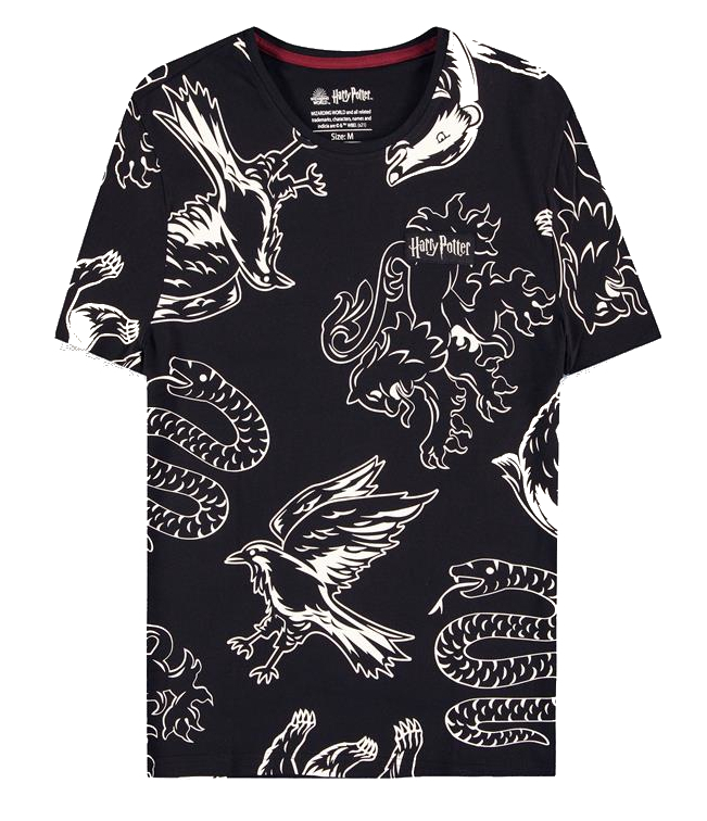 Pánské černé triko s krátkým rukávem a motivem zvířat, které jsou znaky 4 školních kolejí.