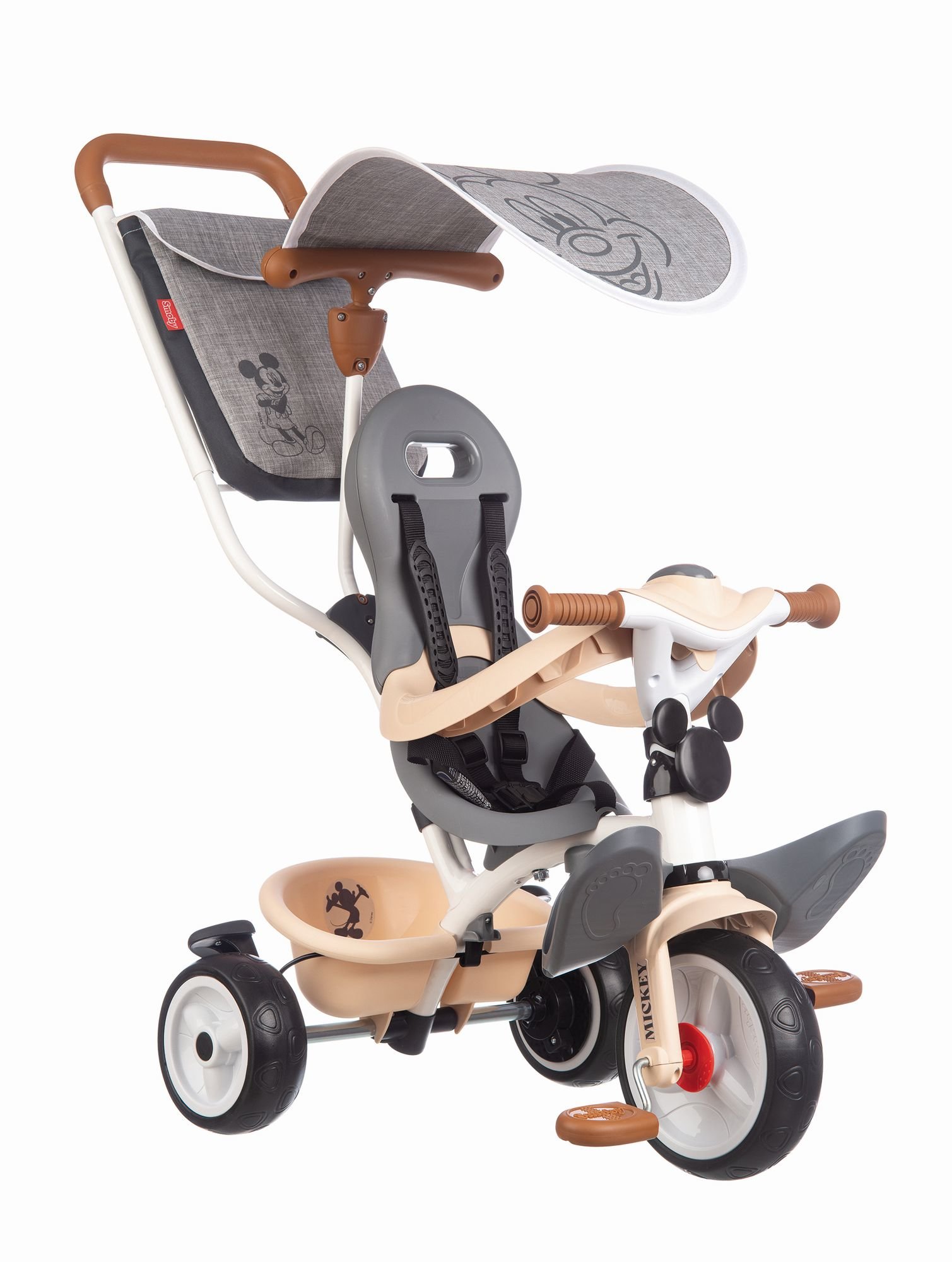 Tříkolka Smoby Baby Balade Plus s motivem oblíbeného myšáka Mickeyho je díky inovativnímu systému řízení kočárkem a tříkolkou v jednom. Promyšlené vozítko pro miminka a batolata jednoduše roste s motorickým vývojem vašeho dítěte postupnou přestavbou. Bezpečnostní zařízení lze v několika jednoduchých krocích po částech snadno odstranit. S Baby Balade Plus od Smoby mohou rodiče určovat směr ještě snadněji: integrovaný systém řízení umožňuje ovládání předního kola přímo pomocí madla. Díky stabilnímu kovovému rámu a rozsáhlé bezpečnostní výbavě je tříkolka vhodná již pro děti od 10 měsíců. Dítě pohodlně sedí v ergonomicky tvarovaném sedadle s opěrkou hlavy a je dokonale chráněno odnímatelným rámem. Sklopné stupačky zajišťují bezpečné držení. Parkovací brzda, šlapací volnoběh, výškově nastavitelné rodičovské madlo s praktickou odnímatelnou taškou a výklopný plastový košík doplňují řadu příslušenství. Sluneční stříška s UV ochranou poskytuje příjemný stín. Bezpečnostní zařízení lze snadno odstranit postupně, jak se vyvíjejí motorické dovednosti. Pak lze řízení pro dítě odemknout jediným kliknutím. Bezúdržbová EVA kola zajišťují tichý chod. Rozměry produktu (DxŠxV): 68 x 52 x 101 cm.