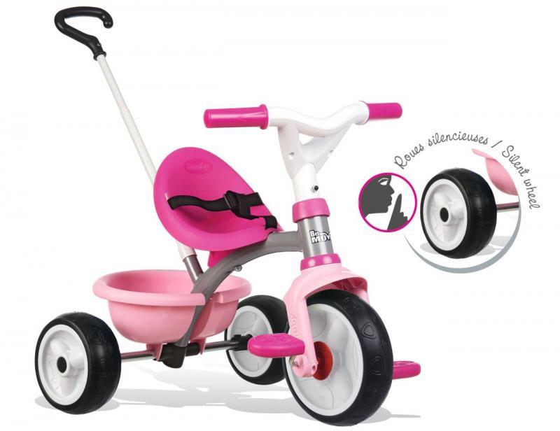 Šlapací tříkolka pro holčičky v růžové barvě má kovový rám, nastavitelnou a odnímatelnou vodící tyč (3 výškové úrovně, max. 95 cm), protiskluzové pedály s možností zablokování šlapání, nastavitelné ergonomické sedadlo na 2 pozice, bezpečnostní pás, výklopný plastový košík a tichá kolečka. Rozměry: 68 x 52 x 52 cm. Hmotnost: 3,49 kg.