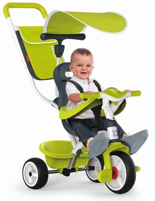 Šlapací tříkolka se stříškou proti sluníčku v zeleném provedení vhodná pro holčičky i chlapečky. Kovový rám, nastavitelná a odnímatelná vodící tyč, lze s ní ovládat i směr jízdy, bezpečnostní ochranný rám a pás, opěrka pro nožičky, pokud dítě ještě nedosáhne na pedály. Plastová kola s protihlukovou úpravou. Možnost zablokování šlapadel, výklopný plastový košík. Praktická taška na vodící tyči. Rozměry 68 x 101x 52 cm. Hmotnost 5,47 kg.