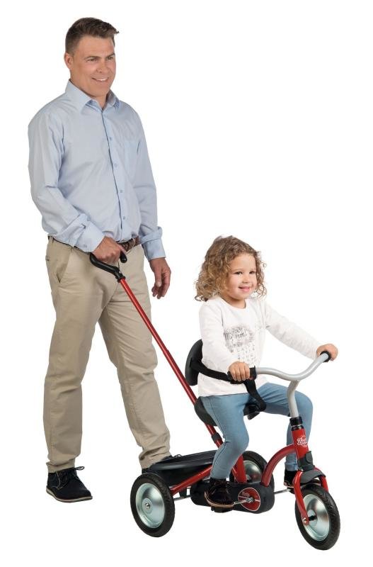 Kovová tříkolka se šlapáním uprostřed. Tichá kola. Systém blokování kol a řidítek. Odnímatelné a nastavitelné rodičovské madlo. Nastavitelná řídítka, odnímatelný bezpečnostní pás i opěrka. Rozměry: 74 x 60 x 51 cm. Hmotnost: 5,168 kg. číst celé