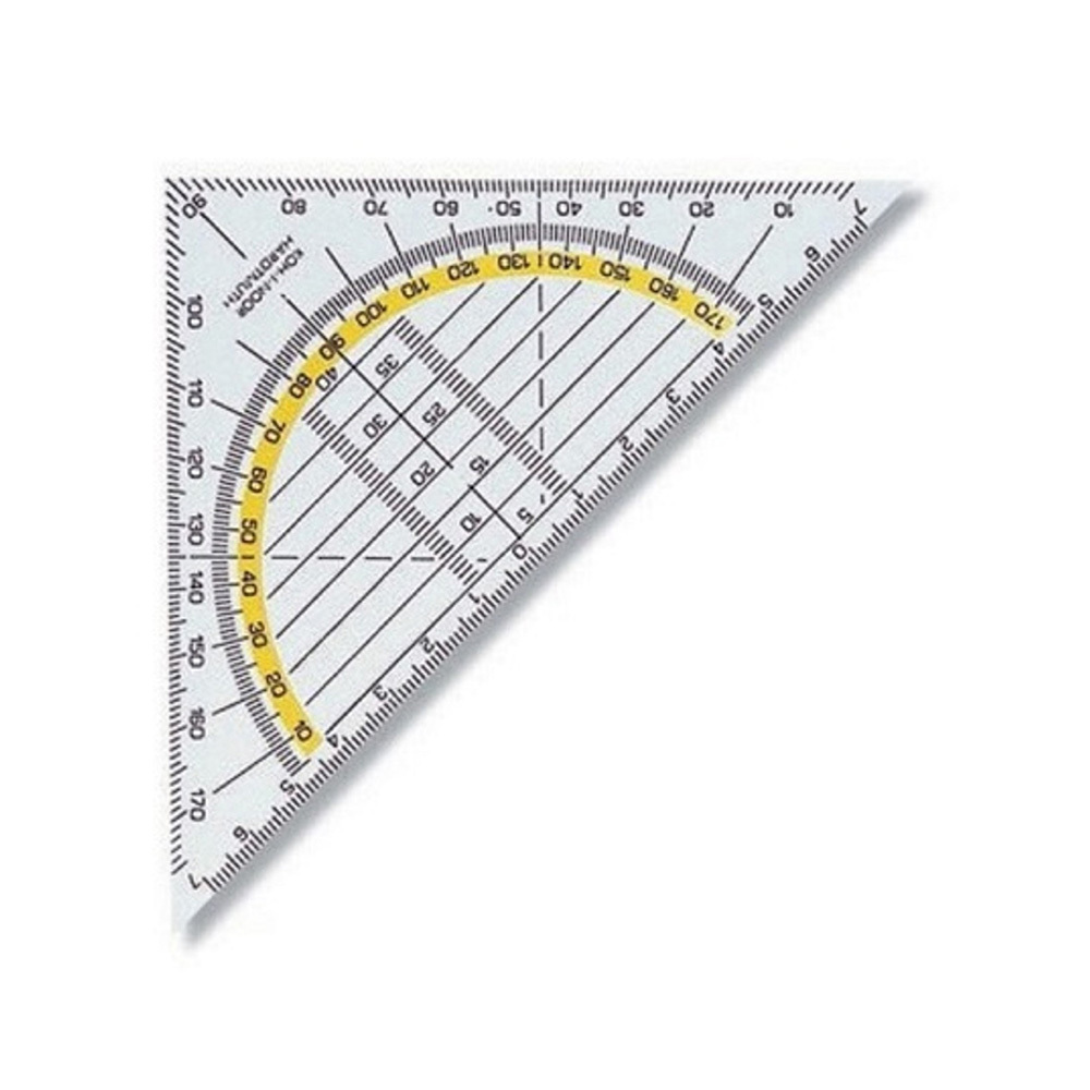 Trojúeolník s uhloměrem, s pravítkem na pravé odvesně, vyrobený z transparentního PVC. číst celé