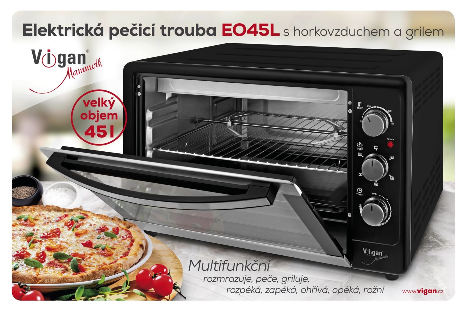 Elektrická pečicí trouba Vigan Mammoth EO45L s horkovzduchem a grilem, Elegantní design, černé provedení s nerez doplňky. Vnitřní povrch z galvanizované oceli, dvojitá skleněná dvířka s bezpečnostním sklem. Využití nejen doma, ale i na chalupách, chatách, ubytovnách, studentských kolejích apod. Velký objem 45 l! Multifunkční: rozmrazování, grilování, pečení, rožnění, opékání, pečení horkým vzduchem 4 samostatná topná tělesa z kvalitního nerezu - 2 horní a 2 spodní 4 funkce - vypnuto, grill, konvekční trouba, grill a konvekční trouba. Otočný rožeň. Časovač do 60 minut s akustickým signálem. Nastavení teploty 100 - 250°C. Příkon 1800 W. Vnitřní osvětlení. Příslušenství: Pečicí plech Otočný rožeň Madlo pro vyjmutí plechu Madlo pro vyjmutí rožně Rošt Rozměry trouby: 573 x 400 x 380 mm Vnitřní rozměry: 400 x 351 x 290 mm Rozměry s obalem: 620 x 427 x 417 mm, Hmotnost: N.W/G.W 10/12 kg