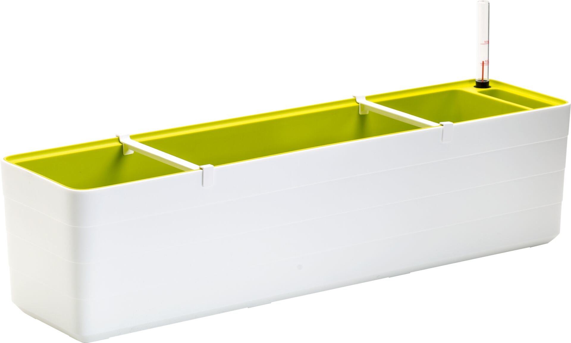 Design truhlíku v kombinaci bílé a zelené barvy přinese do vašeho prostoru svěží a moderní vzhled. S objemem substrátu 15 litrů a kapacitou zásoby vody až 5 litrů nabízí dostatek prostoru pro zdravý růst rostlin. Balíček obsahuje také užitečné příslušenství jako jsou hladinoměr, svorky k upevnění truhlíku a knoty, které zajišťují rovnoměrné zavlažování.