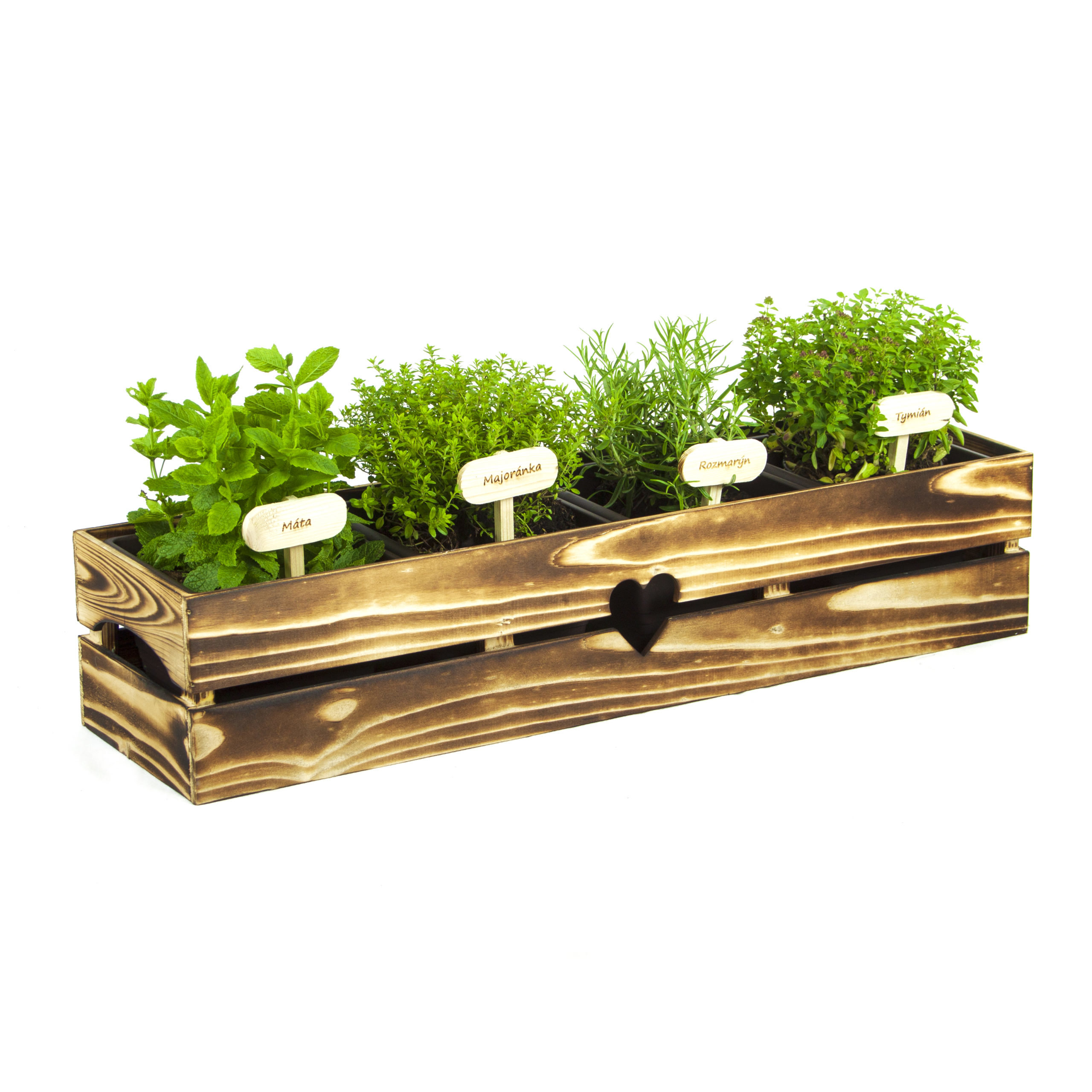 Oblíbený truhlík na bylinky se 4 plastovými vložkami o rozměru 18x18cm.