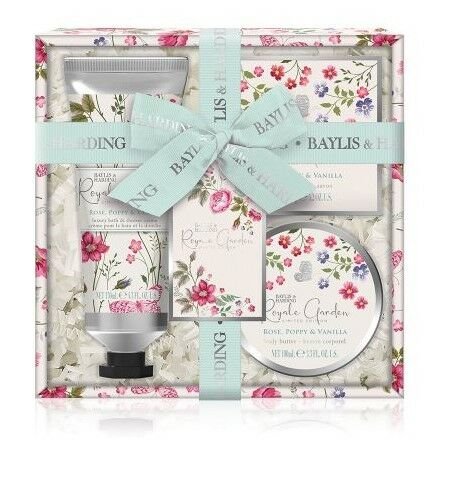 Baylis & Harding Royale Garden sprchový krém Royale Garden Rose, Poppy & Vanilla 130 ml + tuhé mýdlo Royale Garden Rose, Poppy & Vanilla 150 g + tělové máslo Royale Garden Rose, Poppy & Vanilla 100 ml