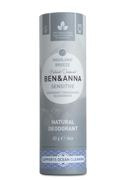Tuhý deodorant Ben & Anna z řady Sensitive je vhodný i pro velmi citlivou pleť. Jeho složení je ještě šetrnější, ale účinnost zůstává. Vůně horského vánku je vhodná především pro muže. Překvapí vás svojí silou a svěžestí. Díky kombinaci vybraných 100% přírodních surovin poskytují deodoranty Ben & Anna spolehlivou ochranu proti tělesnému pachu a potu. Neobsahují hliník ani další škodlivé látky. Baleny jsou do tub vyrobených z recyklovaného a dále recyklovatelného papíru, což přispívá k ochraně životního prostředí! Ben & Anna není jen značka, je to skutečný, mladý a sympatický pár. Po dlouhých letech života v Berlíně, bušícím srdci Německa, se rozhodli vrátit zpět na venkov a žít v souladu s přírodou. A příroda je začala inspirovat natolik, že se vrhli do vývoje produktů, které budou splňovat jejich přísné požadavky.