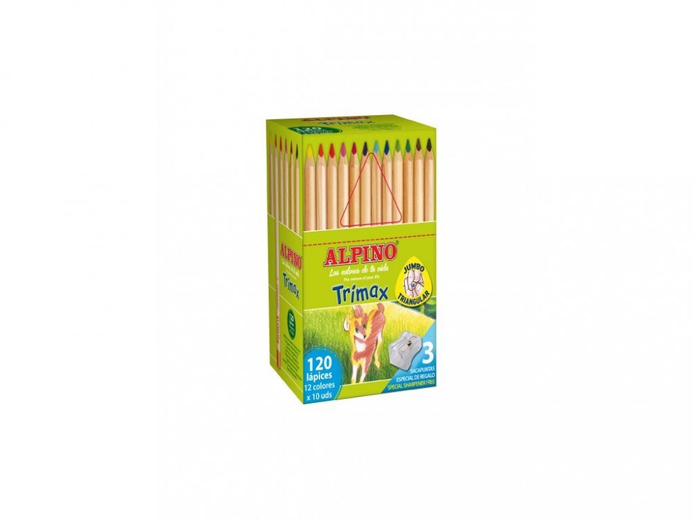 Velké balení pastelek Alpino Trimax 120 ks120 barevných tužek Alpino Trimax (12 barev x 10 ks) + 3struhadlaTrojúhelníkové tužky s ergonomickým trojúhelníkovým tvarem, které se přizpůsobí dětským prstům. Voděodolná tuha 5,4 mm. Tužky poskytují hodiny a hodiny kreativity a zábavy.Upozornění: Pro děti od 3 let. Obsahuje malé části. Toto balení si uschovejte pro budoucí použití. Včetně speciálního struhadla. Není to hračka. Nezasunujte prsty do otvoru s ostrými částmi. Musí ho používat dospělí. Udržujte mimo dosah dětí.