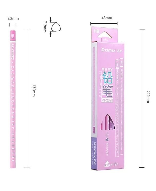 Grafitová tužka Comix Girls HB MP2028 tříhranná zaoblená grafitová tužka z přírodního dřeva je ideální pro školáky a školačky - tvrdost HB. Vysoce odolná grafitová tužka nejvyšší kvality pro umělecké kreslení, psaní i pro technické rýsování. Tříhranné zaoblené lakované tělo má průměr 7.2 mm, jádro (tuha) má průměr 2 - 2,5 mm, délka tužky činí 176 mm. Tužky dodáváme jednotlivě nebo v sadách podle způsobu použití.