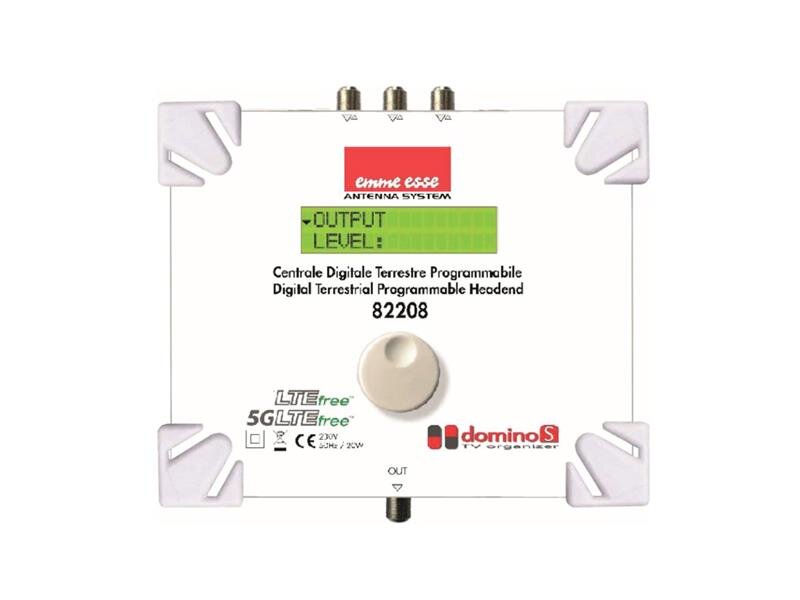 Anténní zesilovač DOMINO S Cod. 82208 výrobce Emme Esse je programovatelný terestriální zesilovač s nastavitelnými filtry. Zesilovač disponuje třemi vstupy VHF-UHF se ziskem 65 dB / 126 dBμV.