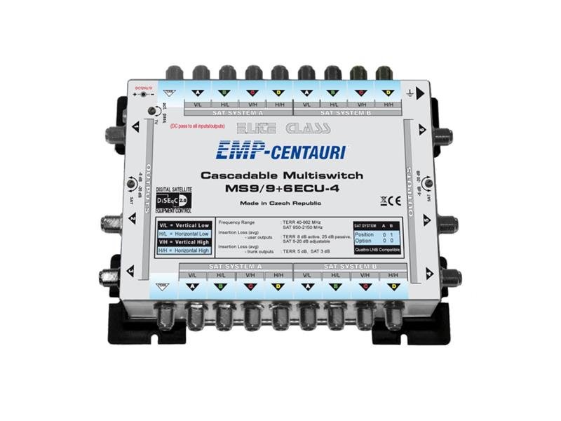 9in/9out+6 kompaktní kaskádní multipřepínač pro distribuci pozemních a satelitních signálů z 2 satelitních pozic (8 polarizací) pro 6 účastníků. Multipřepínač je napájen z připojených satelitních přijímačů, zdířka DC2.1 pro externí napájení přivádí proud na všechna páteřní vedení. Na páteřním vedení TERR je rovněž napětí, vyvarujte se zkratu! Pomocí otočného trimru je možné přepínat pozemní pásmo z pasivního režimu do aktivního režimu. Útlum na uživatelských výstupech v sat. pásmu je nastavitelný atenuátory v rozsahu 5-20dB pro označené skupiny výstupů.