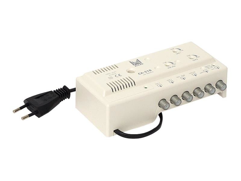 Anténní domovní zesilovač UHF - UHF, III , I , 2x výstup , G42/35 dB, Regulace UHF1,2 - 26 - 42 dB, VHF+FM - 11 - 35 dB, Test 30 dB Zesilovač CA-310 je domovní zesilovač pro pozemní analogový a digitální příjem TV/FM signálů. Je vhodný pro použití v rodinných domech i pro více bytových jednotek. Zesilovač je vyroben v ZAMAC odlitku který má vynikající stínící účinky a je kryt plastovým obalem. Vstupy jsou řešeny pásmově s automatickým napájením předzesilovačů u vstupu UHF1, v případě zkratu dochází k automatickému elektronickému přerušení napájení.+24V. Zesílení všech vstupů je regulovatelné. Zesilovač má testovací vstup a výstup (-30 dB) pro nastavování zapojeného zesilovače.