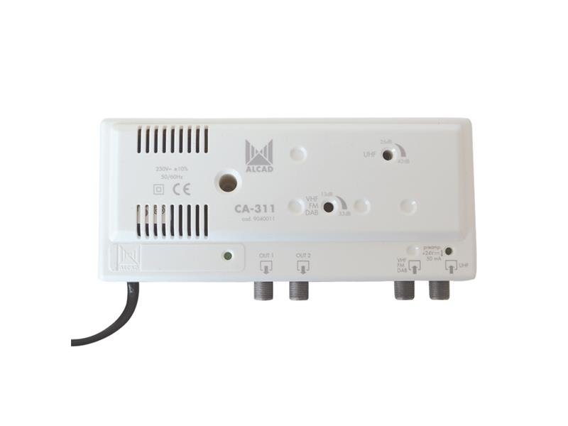 Anténní zesilovač Alcad CA311 je malý domovní zesilovač pro pozemní příjem TV/FM signálů. Je vhodný pro použití v rodinných domech i pro více bytových jednotek. Zesilovač je vyroben v ZAMAC odlitku který má vynikající stínící účinky a je krytý plastovým obalem. Vstupy jsou řešeny pásmově s automatickým napájením předzesilovačů napětím +24V na středním vodiči u vstupu UHF, v případě zkratu dochází k automatickému elektronickému přerušení napájení. Zesilovač má vstupy 1x VHF ( 40-260 MHz) například pro rozhlas VKV II a DAB a 1x UHF (470-862 MHz). Do vstupu UHF je vhodné zařadit filtr 5G nebo LTE, nebo použít antény s těmito filtry. V obou vstupech jsou zařazeny regulační útlumové články. Do výstupu zesilovače je zabudován širokopásmový rozbočovač do dvou směrů. Zesilovač obsahuje zdroj 230V/AC.