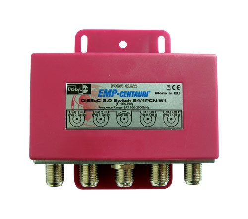 Satelitní relé - přepínač DiseqC 1.0 s obchodním názvem S4/1PCN-W1 (starší označení P.164 IW) výrobce EMP Centauri obsahuje přepínač pro přepínání až 4 satelitních pozic do jednoho výstupu pro jednoho uživatele. Je určen k přepínání mezi 2 až 4 LNB, které se v menu přijímače adresují jako DiSEqC 1/2/3/4 nebo A/B/C/D. Přepínač je v červeném krytu v provedení pro venkovní prostředí. Na výrobek poskytuje výrobce záruku 72 měsíců.