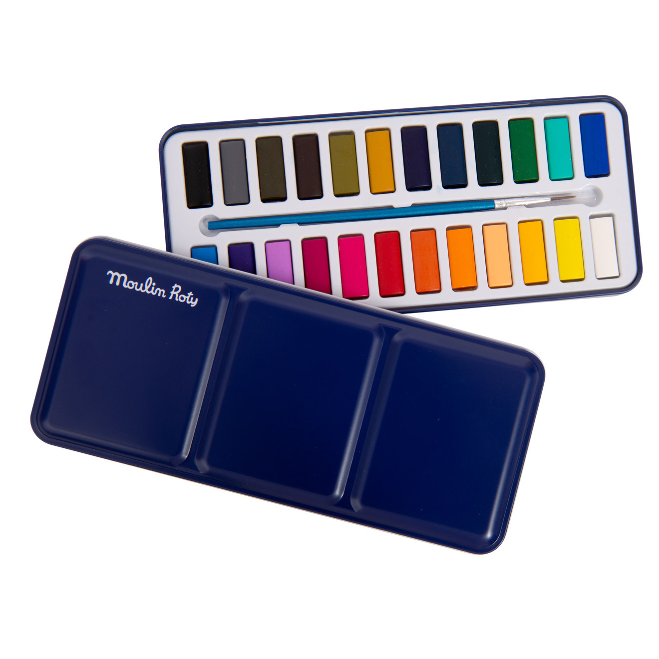 Kovová krabička s 24 akvarely a štětcem.Víčko lze použít jako paletu, takže můžete barvy různě promíchat.