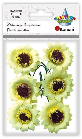 Słoneczniki wykonane z papieru, na druciku w kolorze zielonym, wyglądające jak żywe. Średnica kwiatu: ok. 45 mm. 6 sztuk. číst celé