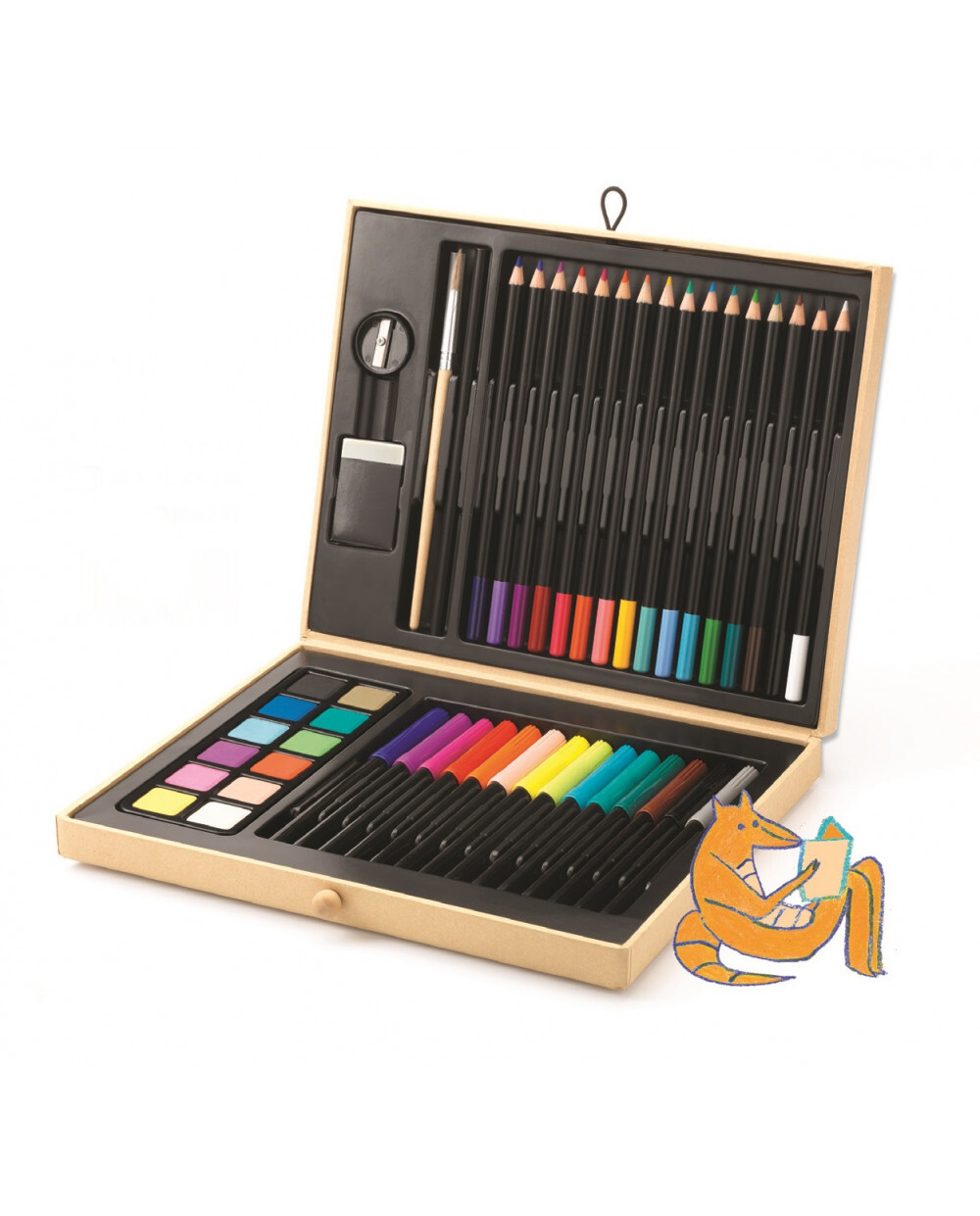 Tento velký výtvarnický kufřík je ideální k tvoření a je plný výtvarných potřeb. Kufřík obsahuje 15 fix, 16 pastelek, 12 vodových barev, štětec, ořezávatko a gumu, vše v praktických přihrádkách, aby se nic nepoztrácelo.