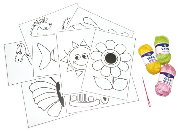 Tento set obsahuje 8 šicích karet s různými motivy, které vám umožní vytvářet originální vzory. Součástí je také jehla a 10 návleků akrylové příze v pestrých barvách - zelené, růžové a žluté - ideálních pro jemné a barevné vyšívání. Každá příze má hmotnost 10 g a délku 36 m, což vám zaručí dostatek materiálu pro vaše projekty.