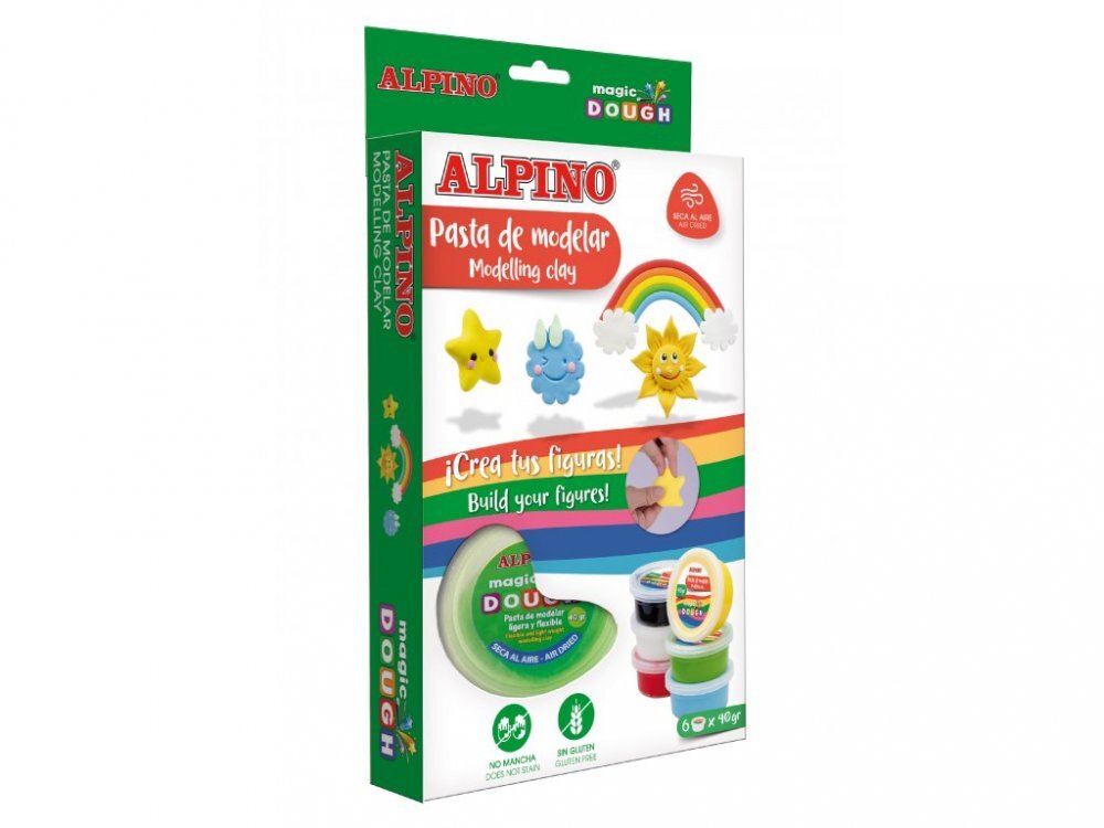 Modelovací pasta Alpino Magic Dough Day & Nightmodelovací pasta Alpino Magic Dough (6 x 40 gr) - den a noc + brožura krok za krokem + nástroj pro úpravu.Lehká a flexibilní modelovací pasta pro hraní a vytváření fantastických postav. Elastická, plně mísitelná. Nebarví a neobsahuje lepek ani žádný z hlavních alergenů. Schnoucí na vzduchu.Upozornění: Nevhodné pro děti do 3 let. Obsahuje malé části, které by mohly být spolknuty nebo vdechnuty. Tento obal si uschovejte pro další použití.