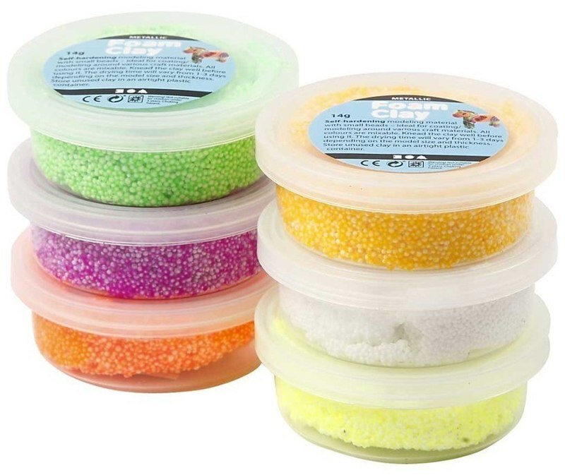 Foam Clay to samotwardniejąca masa modelarska na bazie wody z dodatkiem kulek styropianowych. Można stosować na różnych powierzchniach (drewno, papier, nieszkliwiona ceramika, materiał itp.). Można łączyć kolory lub malować akrylowymi farbami po wyschnięciu. Przed użyciem należy wymieszać! Przechowywać w zamkniętym plastikowym pojemniku. Wymiary opakowania: wysokość 15,5 cm, średnica podstawy 7,8 cm, kształt walca. Zawiera 6 opakowań po 14 gram masy, różne kolory.