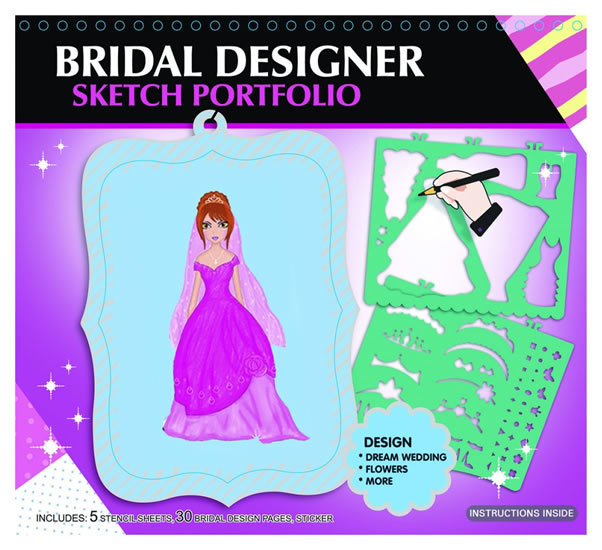 Skicák svatební návrhářka obsahuje šablony, nálepky, návody a prázdné papíry s předtištěnými vzory pro tvorbu úchvatných svatebních modelů.