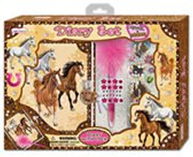 Set obsahuje diář se zámkem a klíči, zdobené pero s peřím, arch dekorativních šperků a nálepky
