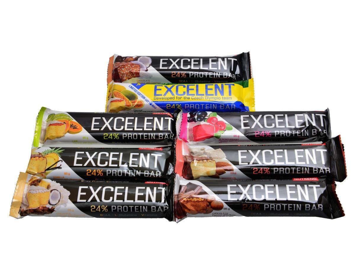 Excelent Protein Bar - Delikátní dvouvrstvá proteinová tyčinka. Excelent Protein bar je tyčinka bohatě posypaná ovocem či oříšky, zalité v čokoládě nebo jogurtové polevě. Excelent Protein bar obsahuje 24% bílkovin a 43% sacharidů. TA CHUŤ TĚ DOSTANE! WHEY PROTEIN CONCENTRATE - SOY PROTEIN ISOLATE - BCAA - L-GLUTAMINE - VITAMINE Excelent Protein bar je proteinová tyčinka delikátní chuti s vyváženým podílem bílkoviny pro kvalitu svalové hmoty.