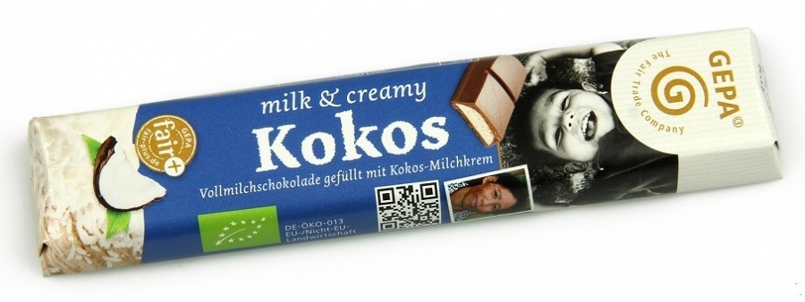 Jemná Fair Trade bio čokoládová tyčinka z mléčné čokolády plněná mléčným krémem s kokosovými lupínky ze Šrí Lanky. Krémová čokoládová tyčinka, která nadchne malé i velké.