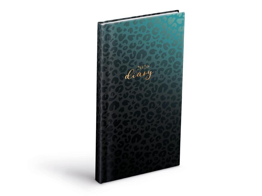 Týdenní diář 2026 zaujme tmavým přechodem barev od smaragdové po černou, doplněným o jemný leopardí vzor. Tento moderní design s nádechem zvířecího motivu je elegantní, ale zároveň odvážný - ideální pro ty, kteří mají rádi výrazný styl.