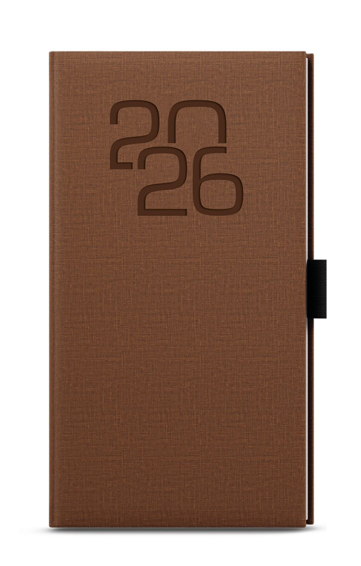 Kapesní týdenní diář z příjemného materiálu v hnědé barvě a s moderní ražbou roku. Trendy a praktický doplněk do každé kapsy. Diář má velký prostor pro poznámky a plánování. strukturovaný materiál, šitá vazba V8, ražba roku, poutko na tužku, stužka, perforované rožky, ofset, 70g/m2