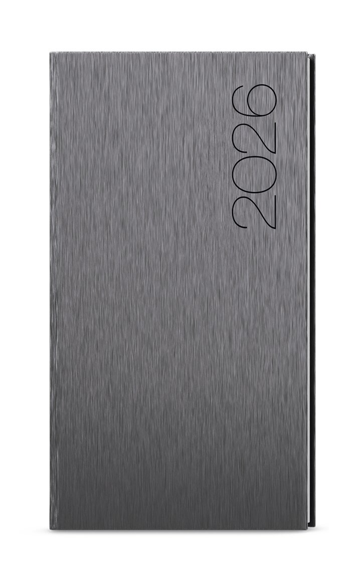 Kapesní týdenní diář v lesklé šedé barvě se strukturovaným povrchem. Moderní doplněk do každé kapsy. Diář má velký prostor pro poznámky a plánování. lesklý strukturovaný jemný materiál, ražba roku přes černou pásku, šitá vazba V8, stužka, perforované rožky, ofset, 70g/m2