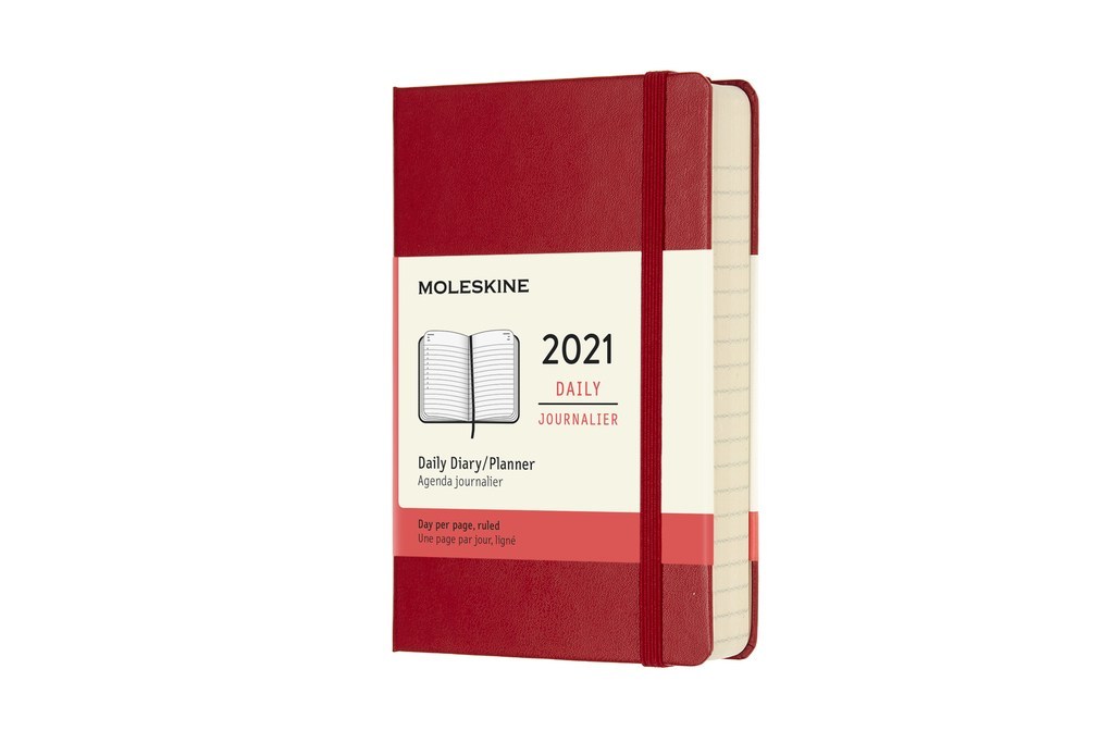 Klasický červený denní diář kapesní velikosti na rok 2021. Na každý den stránka pro poznámky a schůzky. Diář má pevnou, ve hřbetu šitou vazbu v kartonových deskách. Obepíná ho pružná páska proti samovolnému otevírání. Obsahuje praktickou vnitřní kapsu na vizitky a dokumenty, textilní záložku a 295 barevných samolepek. Papír s gramáží 70 g/m2 neobsahuje kyseliny.