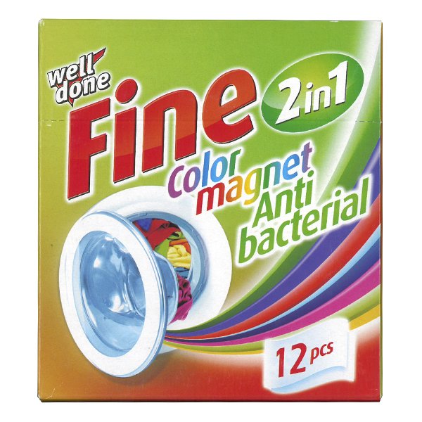 Fine Antibakteriální- ubrousky na praní barevného prádla - pohlcující barvy 12Ks Během praní vlivem pracího prostředku a teplé vody, některé oděvy pouštějí barvu a způsobují probarvení ostatních oděvů. Ubrousky zajistí, že můžete prát spolu oděvy různé barvy a zabrání jejich zešednutí a přebarvení. Díky složením jako vedlejší účinek je antibakteriální. Balení 12Ks ubrousků